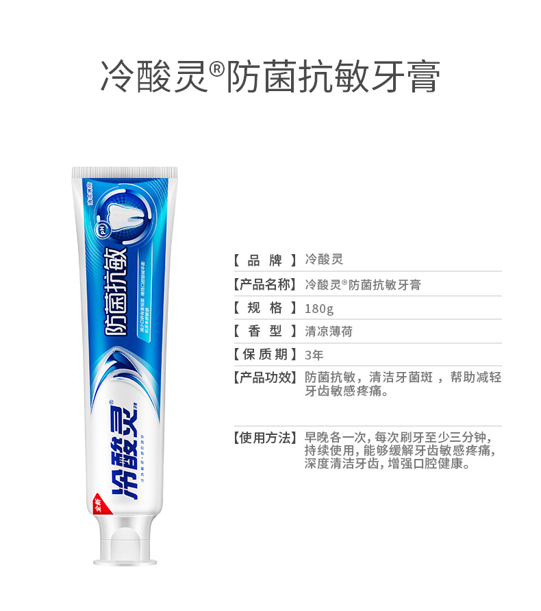 • 商品名称:冷酸灵牙膏防菌抗敏180g*1支清凉薄荷清新口气增白牙齿清洁 1件装